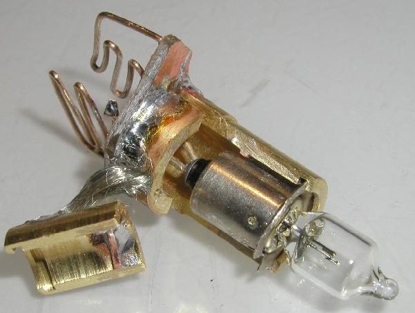 Zur Führung der Birne wird Kupferdraht um diese gewickelt/gebogen, aufgeschnitten und an sichtbarer Position in die beiden Halbschalen gelötet. Eventuell noch auf Passung aufschleifen (die kleinen Schleifkappen in den Werkzeugsets von Proxxon haben genau den passenden Durchmesser).