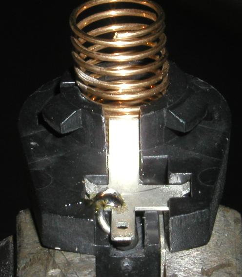 In älteren Sockeln war die Begrenzungsdiode nur geklemmt und der Kontakt war relativ unsicher. Zudem war die Position in dem zylindrischen Raum hinter dem Masseblech schlecht gekühlt (Keine Luftkühlung, ein Bein an der birnengewärmten Feder, nur das Massebeinchen über eine kleine Kontaktzone zur äußeren Umgebung). Hier kann man einfach die Kontaktfeder, leicht drehend, herausziehen, die Begrenzungsdiode mit einer Spitz-Zange fassen und herausziehen und dann bei Schritt drei weitermachen.