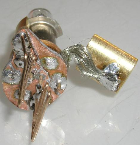 Zur Führung der Birne wird Kupferdraht um diese gewickelt/gebogen, aufgeschnitten und an sichtbarer Position in die beiden Halbschalen gelötet. Eventuell noch auf Passung aufschleifen (die kleinen Schleifkappen in den Werkzeugsets von Proxxon haben genau den passenden Durchmesser).