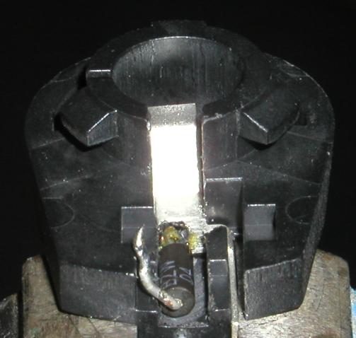 Ich baue die Dioden alle zwischen den Blechen ein und verlöte sie mit diesen. So ist eine optimale Wärmeabfuhr (Luftzutritt und guter Anschluß an Luft/Rahmengekühlte Bauteile) und Kontaktsicherheit gewährleistet. In diesem Einbau übersteht die Diode auch schon mal eine halbe Stunde (länger dauerte die Fahrt nicht) an einem starken SON bei einem 30er Schnitt und ausgefallener Glühbirne. Und dabei wird dann das DToplightPlus nicht gegrillt. Der Serienscheinwerfer reichte als Fahrlicht locker:=)