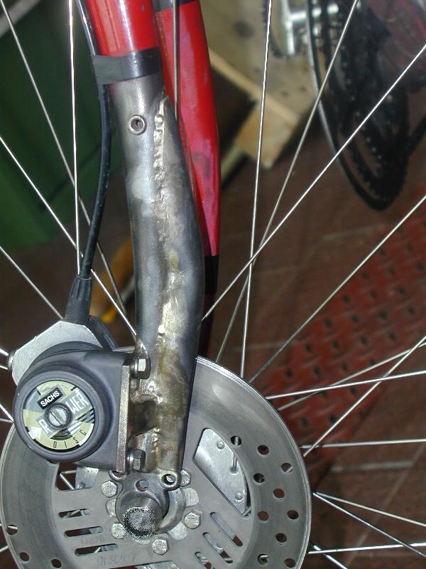 zusammengebogenes Oberrohr ist auf die Gabelscheide (nach dem Richten)