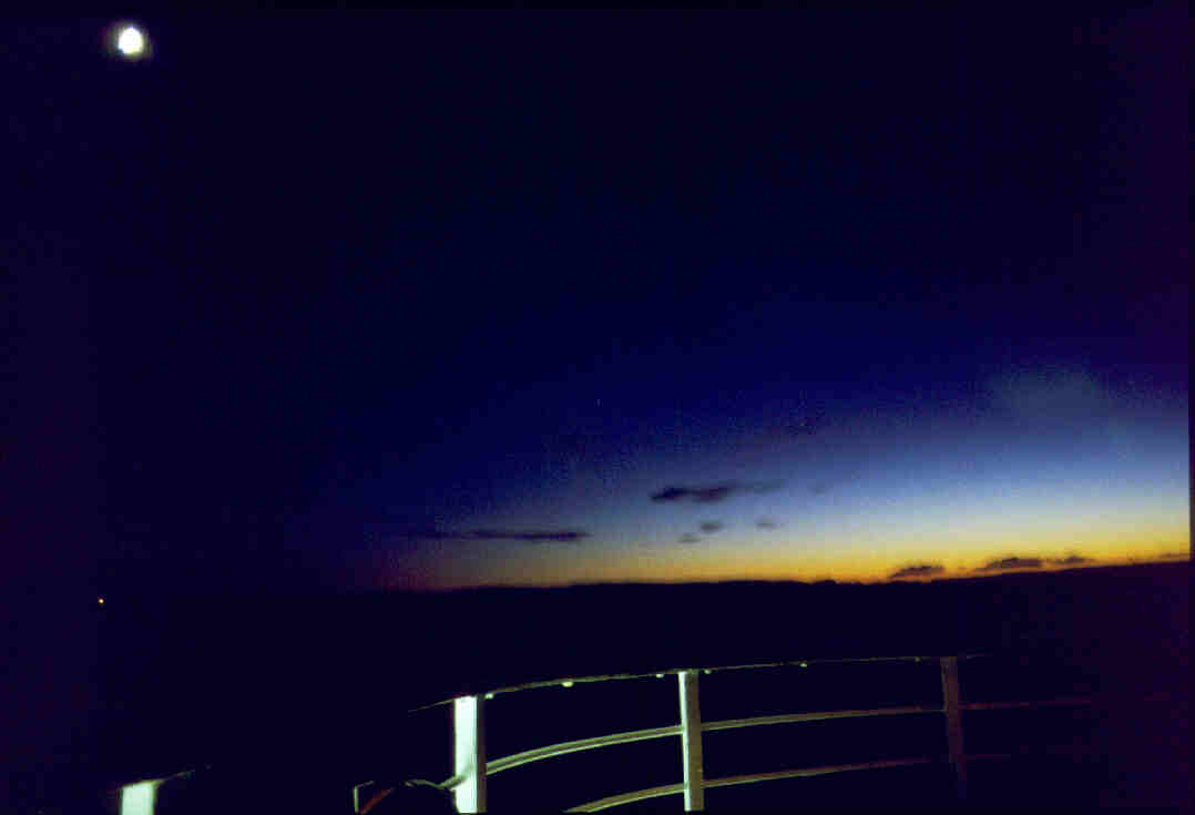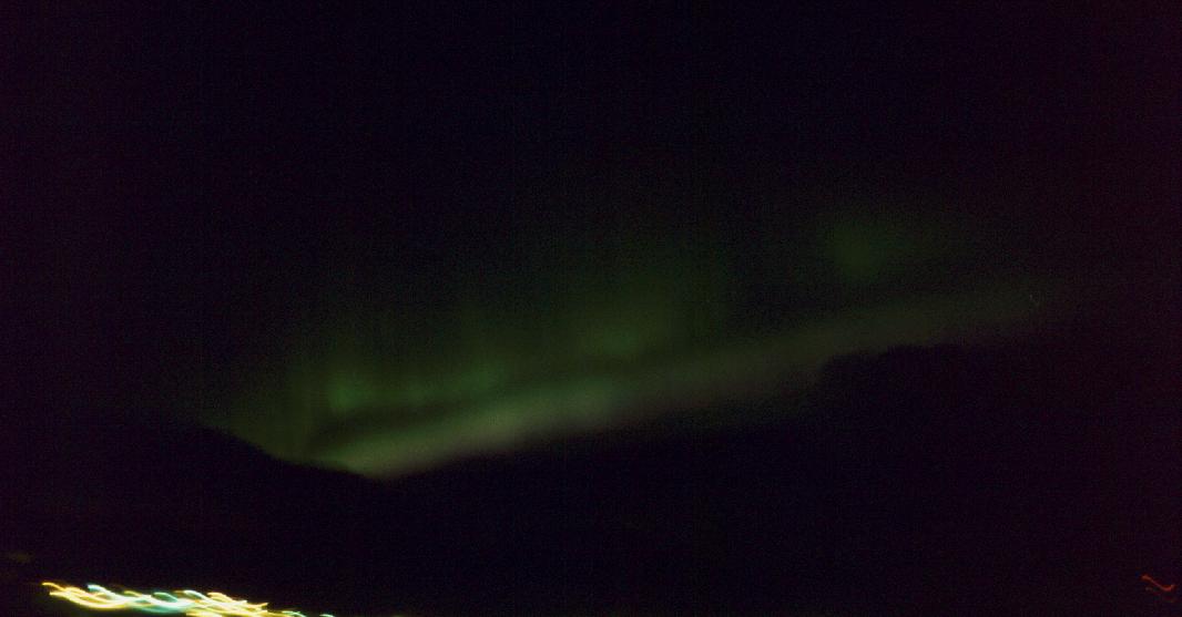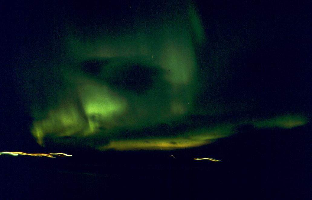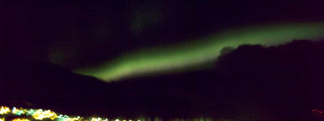 Zu den Polarlichtern schreibe ich hier wenig Grundsätzliches, da reicht eine Suche auf z.B. www.yahoo.de mit dem Stichwort Polarlicht vollkommen aus. Wir hatten vorwiegend grüne und gelbgrüne Lichter, die am Ende unten einen roten bis lila Saum erhielten. Ein Zyklus dauert nach Gefühl (bei seinen ersten Polarlichtern guckt man nicht auf die Uhr) ca. 30-45 Minuten. Es fängt langsam und schwach an und wird langsam stärker. Dann fängt es an auszubeulen (Bild 22 ff.) und wie ein Vorhang zu wehen. Dabei kommt dann auch der lilane Saum zum Vorschein. Es ist wirklich mit einem langsamem Vorhangwehen vergleichbar; das Video, welches unter http://www.uit.no/npt/nordlyset/nordlys.mov (1137 kB) oder nordlys.mov abrufbar ist, wird zumindest auf einem K6/200 mit Miro SV40 (S3 968) bzw. MGA Millenium II mit xanim unter LinuX viel zu schnell abgespielt.